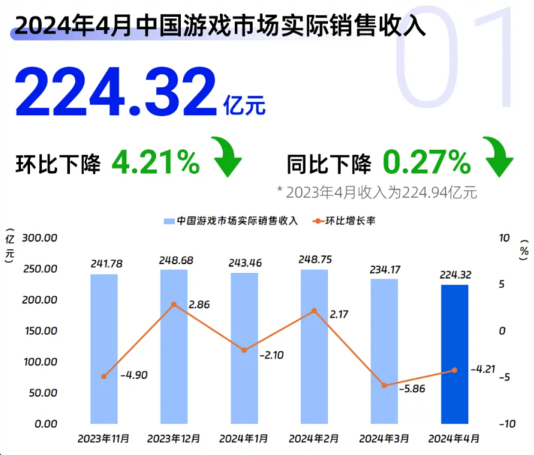 论说骄贵,2024年4月中国游戏商场收入224.32亿元,环比下跌4.21%,同比下跌0.27%,其中,中国迁移游戏商场实质销售收入159.05亿元,环比下跌6.18%,同比下跌1.93%,中国客户端游戏商场实质销售收入5642亿元,环比增长2·06%,同比增长1.47%。中国自主研发游戏国际商场实质销售收入14.18亿好意思元,环比下跌0.65%,同比增长7.03%。