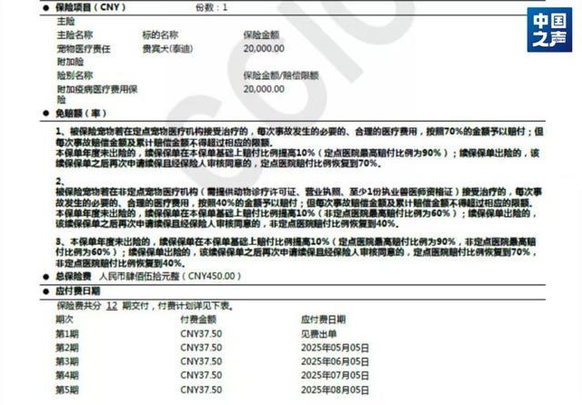 陈奕提供给记者的保单披露,这份宠物险从本年4月5日收效,有用期一年,保障金额两万元,被保障宠物如若在定点宠物医疗机构遴选诊疗,按照70%的金额赐与赔付,非定点宠物医疗机构则按照40%来赔付。