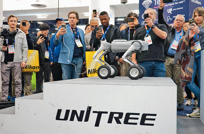 在 2025 年好意思国拉斯维加斯破费电子展上,东谈主们在中国企业宇树科技的展区不雅看机器狗展示(2025 年 1 月 8 日摄) 新华社发(曾慧摄)时候-政事-闲雅交汇的当代性叙事