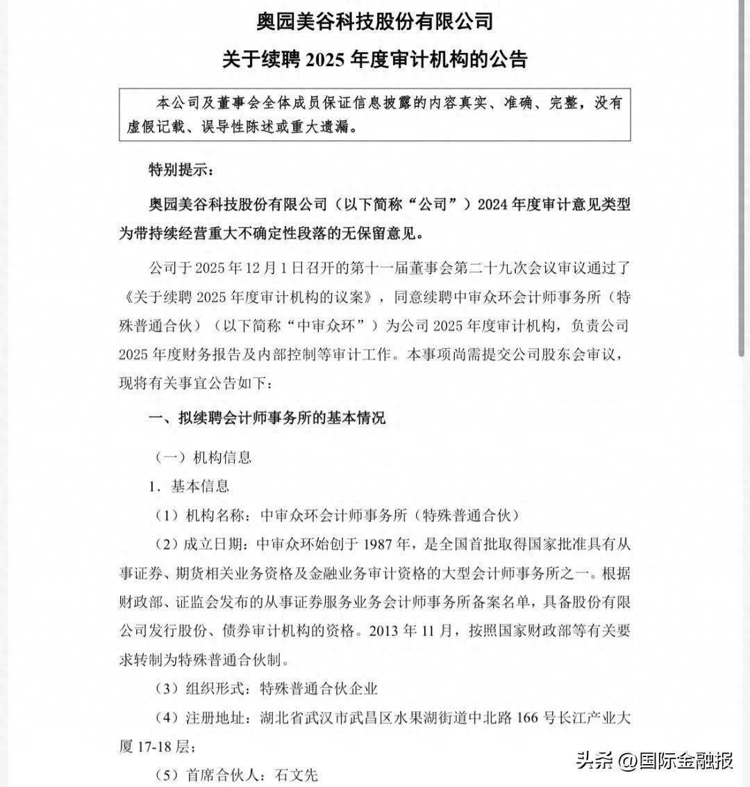 12月1日晚间,*ST好意思谷公告暗意,董事会经审议,甘愿续聘中审众环管帐师事务所(迥殊平凡结伙)为公司2025年度审计机构,追究公司2025年度财务证据及里面戒指等审计使命,当今该有策画还需提交临时股东会审议。