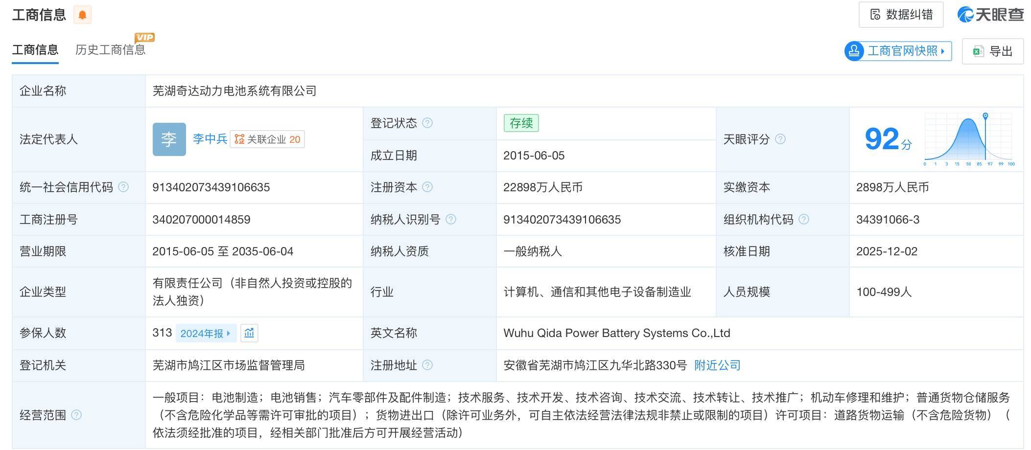 该公司开垦于2015年6月,注册老本约2.3亿元东说念主民币,观念规模含电板制造、电板销售、汽车零部件及配件制造、无邪车修理和珍爱、平凡货品仓储就业、货品出进口等。激动信息闪现,该公司由奇瑞汽车旗下芜湖埃科泰克能源总成有限公司全资抓股。